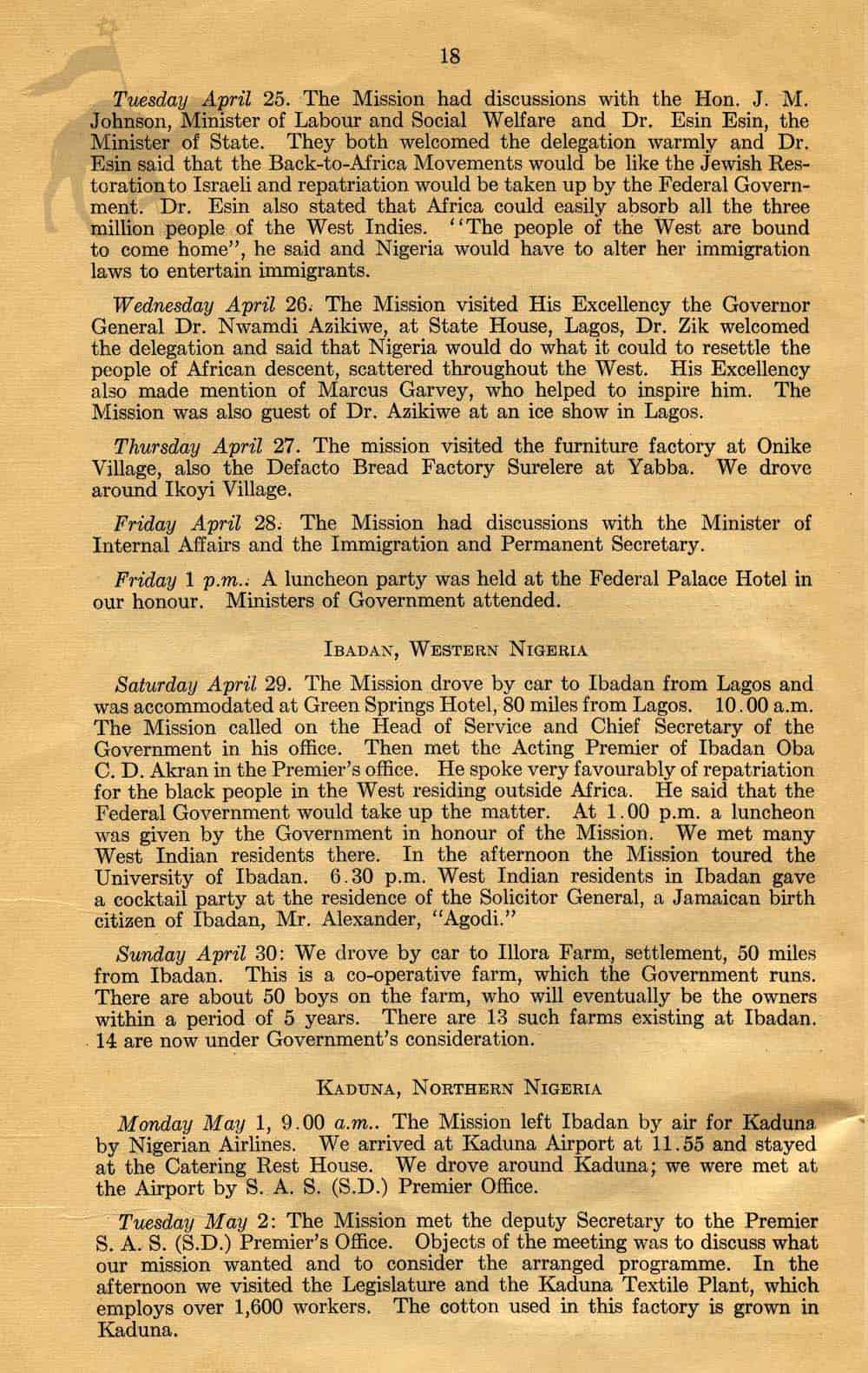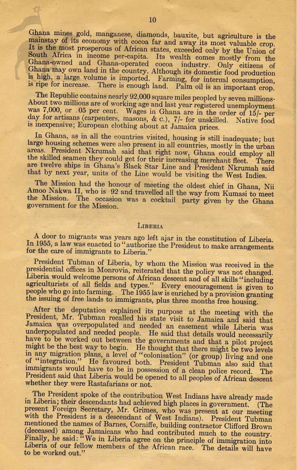 In 1961 the "Back to Africa" Mission, sponsored by the Jamaican Government had traveled inside 5 African States and had talks with the Head of each State about their migration policies and the possible movement of people from Jamaica to settle in those African countries.