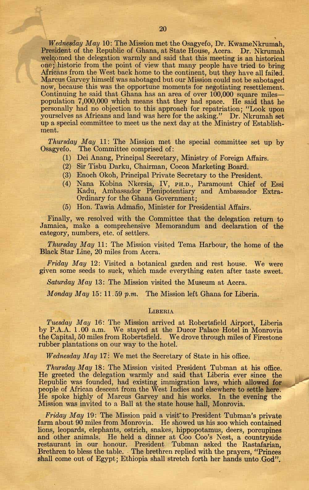 In 1961 the "Back to Africa" Mission, sponsored by the Jamaican Government had traveled inside 5 African States and had talks with the Head of each State about their migration policies and the possible movement of people from Jamaica to settle in those African countries.